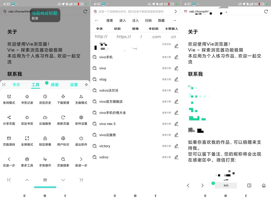 【应 用 介 绍】:Vie浏览器APP一款精简浏览器应用,软件非常的小巧,但是功能很齐全,基本什么网页都可以浏览,并且软件还提供了网盘功能,可以在线存储文件,在浏览界面或者阅读小说的时候,会自动屏蔽广告内容,非常好用的一款手机浏览器