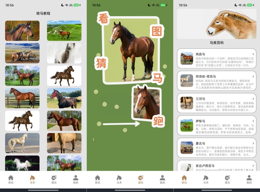 【软件介绍】:提供丰富的马类百科知识与马术教程, 助您了解不同马种与骑术 技巧。内置“看图猜马”趣味游戏,在轻松互动中巩固认知,适合 马术爱好者与初学者拓展视野。